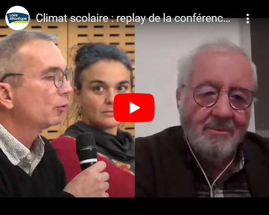 Revivez les échanges de la conférenceArticle publié le 11/10/2023 par le Conseil départemental de Loire-Atlantique.Le Département et l’association FCPE 44 ont invité Éric Debarbieux, Professeur émérite de Sciences de l’Éducation à l’Université Paris-Est Créteil, à apporter ses éclairages sur ce sujet complexe du climat scolaire, le 7 novembre 2023. Le titre de la conférence : “Bien vivre l’École, l’affaire de tous ?”. Un temps d’échanges destiné aux parents d’élèves, ainsi qu’aux membres de la communauté éducative. Visionnez le replay.